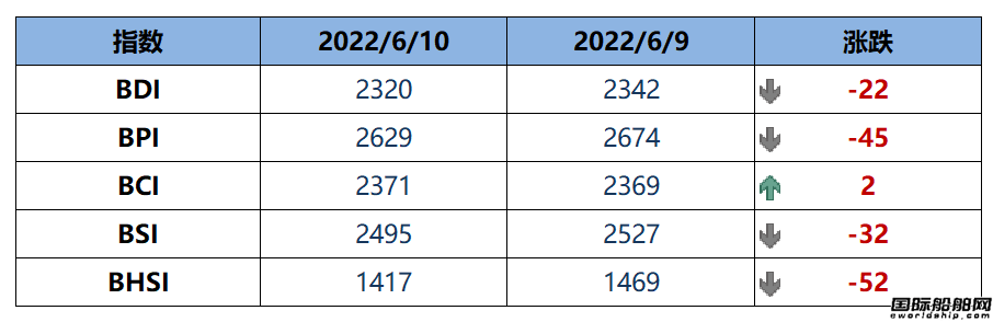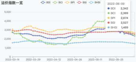 6月9日,波羅的海干散貨運價指數(BDI)報2342點,較前一交易日下跌68點或2 8%;波羅的海海岬型船指數(BCI)報2369點,較前一交易日下跌88點,大跌3 6%。...