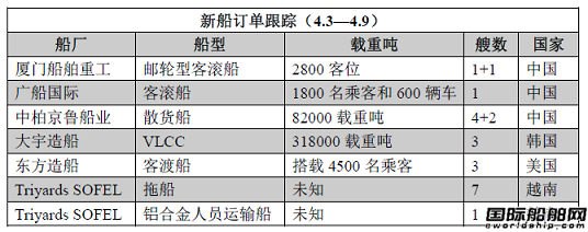據(jù)國際船舶網(wǎng)跟蹤:2017年4月3日至2017年4月9日,全球船廠共接獲20+3艘新船訂單。其中,中國船廠共獲得6+3艘新船訂單;韓國船廠獲得3艘新船訂單;美國和越南船廠也獲得相關新船訂單。