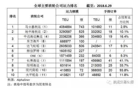 根據Alphaliner截至6月29日的數據,中遠海運集運現排名為全球第4,東方海外排名為全球第8,雙方合計運力規模達到272.52萬TEU,成功超越達飛輪船,距離第2位的地中海航運運力規模相差56.54萬TEU。