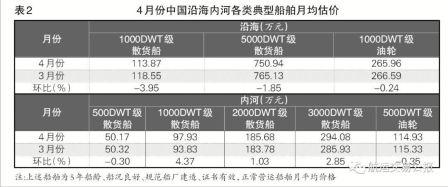 4月,沿海散貨船價格全線下跌,內河散貨船價格漲多跌少,油輪價格小幅下行(見表2)。