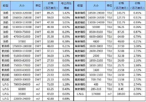 7月份,國際新造船市場各船型價格數據詳見下表。