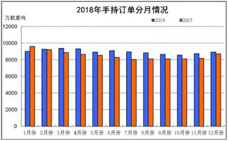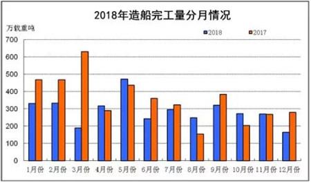 2018年,全國造船完工量3458萬載重噸,同比下降14%,其中海船為1100萬修正總噸;新承接船舶訂單量3667萬載重噸,同比增長8.7%,其中海船為1077萬修正總噸。截至12月底,手持船舶訂單量8931萬載重噸,比2017年底手持訂單量增長2.4%,其中海船為2862萬修正總噸,出口船舶占總量的89.1%。