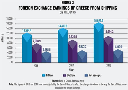 下圖顯示了2016-2018年希臘航運業所貢獻的外匯收入
