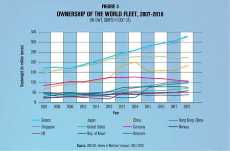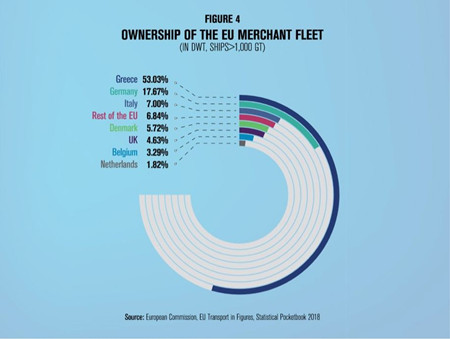 這些數字的確令人驚嘆。盡管希臘只占有全世界0.15%的人口數量,該國持有的船舶噸位卻占據全球總量的21%。希臘的商船船隊是全球規模最大的船隊,共有4936艘船舶(每艘1000總噸以上),共計3.8969億載重噸,相比上一年增長了大約6.63%。從2007到2018年,希臘船東的船舶運力翻了不止一番。按載重噸計算,希臘所持船隊在歐盟船隊中占比53%,在世界船隊中占比20.9%。