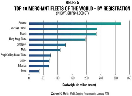 下圖顯示了全球10大商船船隊(按船籍分)