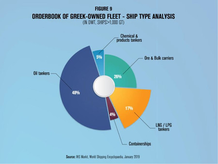 2019年初,希臘訂造的新船數量達到了223艘,(每艘在1000總噸以上),覆蓋了各種船型,共計2503萬載重噸。與此同時,全球新船訂單共有2578艘、1.8978億載重噸。