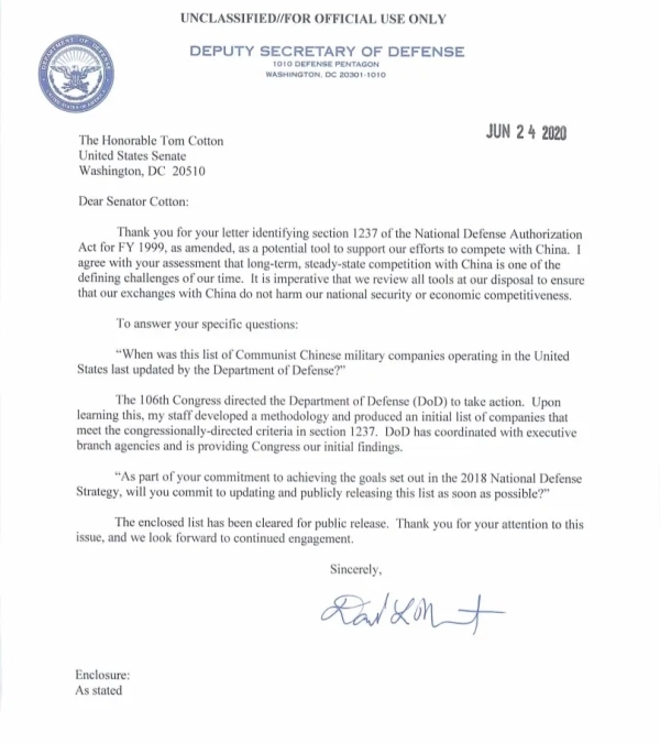 據悉,在6月24日由美國防部在一封寫給國會議員的信中提到這份清單,五角大樓發言人喬納森·霍夫曼稱,“該清單包括由中國政府、軍方或國防工業擁有、控制或存在關聯的實體。”