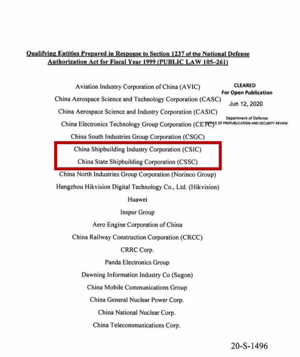 據路透消息,特朗普政府已經決定將包括電信設備巨頭華為和視頻監控公司海康威視在內的20家中國企業列為“中國軍方擁有、控制或有關聯”的公司清單,20家中國企業中包括中國船舶集團合并前的“南北船”,這意味著美國金融制裁可能進一步升級。而這份清單似乎證明美國對中國的“打壓遏制”早在20年前就已經開始準備。