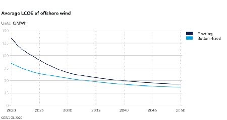 擺脫海洋深度的限制,用風力發電為包括亞太大城市在內的世界上更多人口供能,將是一個極具吸引力的選擇。盡管預計其平均成本仍將高于固定式海上風電,但隨著兩者成本同時下降,其價格差異將縮小。成本節省的關鍵將是引入更大型的渦輪機、更大規模的風電場、重大的技術發展以及建立具有高度成本競爭力的供應鏈。