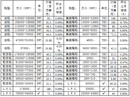 12月份,國際新造船市場各船型價格數據詳見下表: