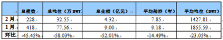 2月份,國(guó)內(nèi)二手船價(jià)格跌多漲少,市場(chǎng)總成交艘數(shù)和成交金額繼續(xù)萎縮。
