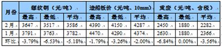 1-2月份國(guó)內(nèi)螺紋鋼、造船板和重廢月平均價(jià)格