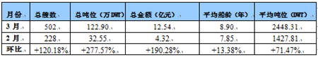 3月份,前期受疫情因素影響的船舶集中進場交易,國內散貨船、油輪成交量大幅增加。其中,內河散貨船共計成交431艘,77.42萬DWT,成交金額9.38億元人民幣,平均船齡9.05年;內河油輪共計成交16艘,8267DWT,成交金額1060萬元人民幣,船齡12.99年。