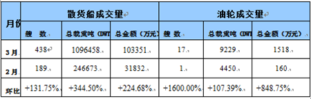 3月份,國內二手油輪船價普遍下跌,二手散貨船價格走勢各異,其中,沿海散貨船價格逐步上漲,內河散貨船價格漲多跌少;隨著國內疫情的逐步把控,二手船市場交易活躍度逐步提高,市場總成交艘數、總成交噸位和成交總金額報復性反彈。
