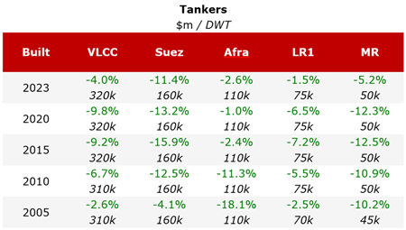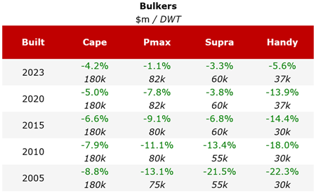 就船舶資產價值而言, 舉例來說,VesselsValue數據庫中的一艘船齡為10年,常見的好望角型散貨船的估值,在2020年初為2050萬美元,到了3月,已降至1750萬美元。