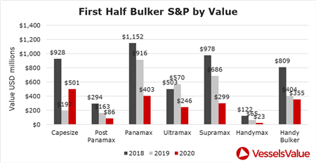 與2019年和2018年的上半年相比,2020年同期散貨船領域的二手交易數量分別下降了31%和49%。