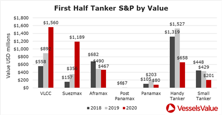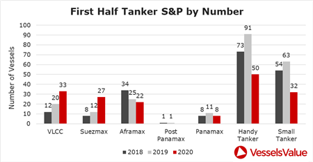 2020年上半年,大型油輪的二手交易量有所增長,其中超大型油輪(VLCC)和蘇伊士型油輪(Suezmax)的交易數量相比2019年上半年分別增長了50%和125%。而小型油輪二手交易則相對平靜,小型靈便型油輪的交易數量比去年同期下降了47%,比2018年同期下降了35%。