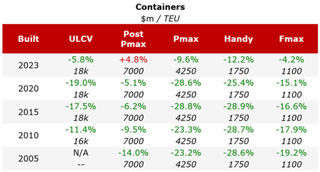 就資產價值而言,較小型、船齡較大的靈便型集裝箱船受影響最為嚴重,下降了約25%。
