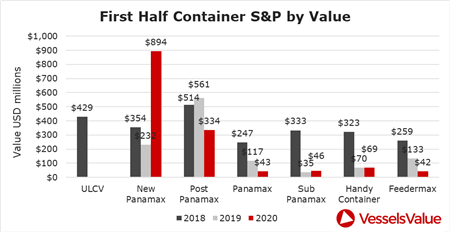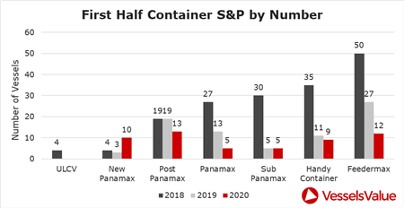 由于市場活動的不確定性,與2019年和2018年同期相比,2020年上半年集裝箱船的二手交易數量總體下降了30%,其中小型集裝箱船的交易量很低。