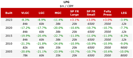 隨之而來的是船舶資產價值的下滑,其中船齡較大的全冷藏式液化石油氣船的價值從1月份的2800萬美元下降到今天的2200萬美元,下降了約20%。