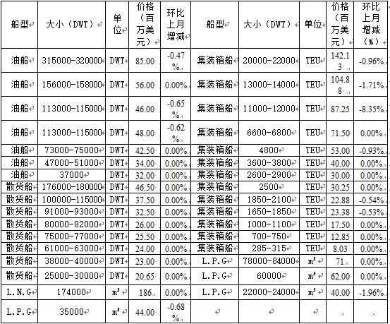 11月份,國(guó)際新造船市場(chǎng)各船型價(jià)格數(shù)據(jù)詳見下表: