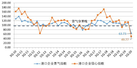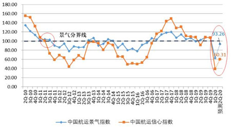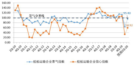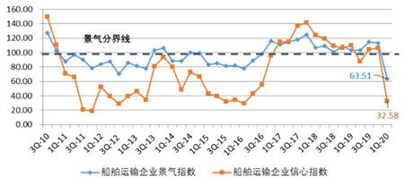 2020年3月31日,上海國際航運研究中心發布2020年第一季度中國航運景氣報告。報告顯示,受新冠肺炎疫情影響,中國航運企業經營嚴重受挫,中國航運景氣指數跌至62.95點,進入較為不景氣區間;中國航運信心指數僅39.05點,跌至較重不景氣區間。中國航運景氣指數與信心指數均創歷史新低,中國航運業再入低谷。