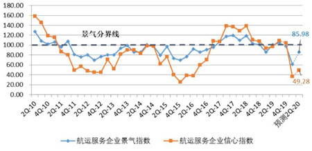 航運服務企業經營狀況將繼續下探。2020年第二季度,航運服務企業景氣指數預計為85.98點,較本季度上升24.56點,進入相對不景氣區間;航運服務企業信心指數預計為49.28點,較本季度上升12.67點,進入較重不景氣區間?傮w來看,航運服務企業景氣指數與信心指數依然處于景氣線之下,航運服務企業家們預計行業總體情況依然較為悲觀,企業家們信心依然不足。