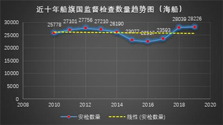 自2010年至2019年近十年海船的船旗國監督檢查數量總的趨勢基本持平,下圖中藍色線段代表每年的實際檢查數量,黃色線段代表檢查量的趨勢。近十年里檢查量最大的是2019年的28226艘次,檢查量最小的是2016年的22517艘次。