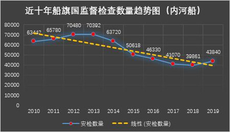 自2010年至2019年近十年內河船的船旗國監督檢查數量總的趨勢是下降的,下圖中藍色線段代表每年的實際檢查數量,黃色線段代表檢查量的趨勢。近十年里檢查量最大的是2012年的70480艘次,檢查量最小的是2018年的39861艘次。