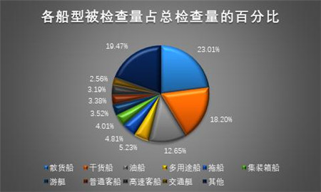 2019年海船被檢查量前十位的船型分別是:散貨船占比23.01%、干貨船占比18.20%、油船占比12.65%、多用途船占比5.23%、拖船占比4.81%、集裝箱船占比4.01%、游艇占比3.52%、普通客船占比3.38%、高速客船占比3.19%、交通艇占比2.56%,其他船型占比19.47%。