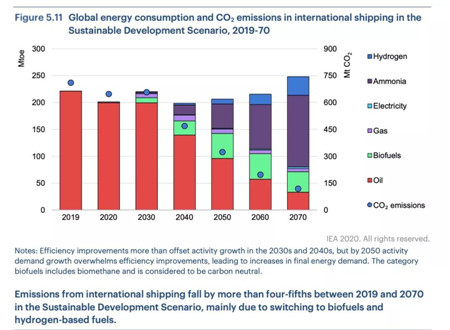 到2070年氫能源將占全球航運燃料16%,生物燃油、氨、氫占80%,消耗全球13%氫產(chǎn)量,石油與天然氣則降至1/6。實現(xiàn)航運業(yè)的凈零排放,而2020年代初,航運排放將達(dá)到最高水平,如2019年--7.1億噸。
