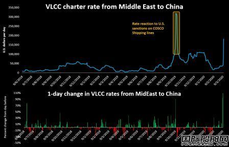 圖:中東至中國航線的超大型油輪(VLCC)包租費率飆升