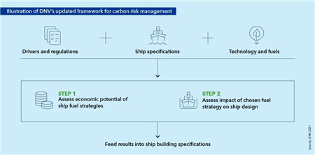 為幫助船東響應脫碳行動,DNV繪制了符合碳減排軌跡的實用路徑。《面向2050年的海事展望》提供了最新的碳風險管理框架(圖1),為船舶找到了最具性價比的Fuel Ready及燃料靈活性的選擇。