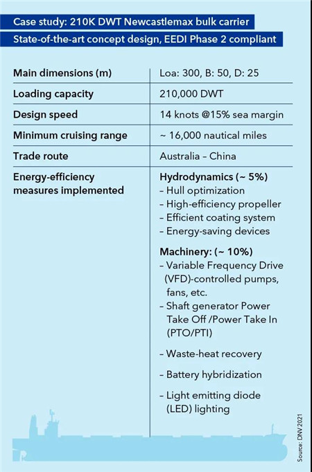 表1:關于21萬載重噸Newcastlemax型散貨船的案例研究,其先進的概念設計符合EEDI第2階段