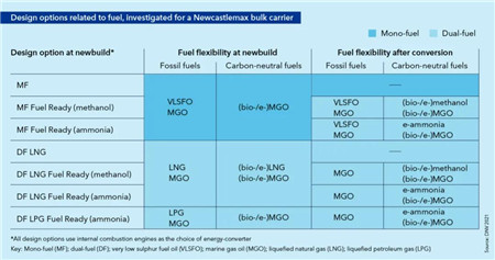 表2:Newcastlemax型散貨船關于燃料的設計選項,顯示了每個設計選項在新造和后續改造(如適用)中的燃料靈活性。