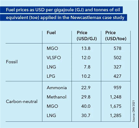 表3:Newcastlemax型散貨船中采用美元/GJ和美元/噸油當量(toe)為單位的燃料價格。價格為未來平均價,其場景是低成本的可再生電力用于生產碳中和的電化燃料。
