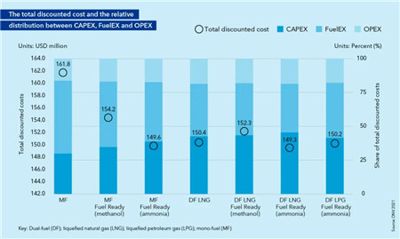 2、與傳統選項相比,氨燃料設計方案的CAPEX更高,但在船舶壽命周期內的燃料支出費用更低。