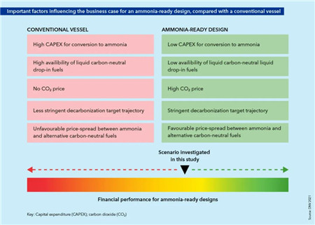圖3:與常規船舶相比的氨燃料設計的重要影響因素。但在因素發生變化的場景下,其他設計可能優于氨燃料設計。