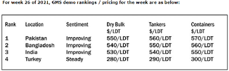 GMS在其每周的市場(chǎng)報(bào)告中稱,整個(gè)次大陸市場(chǎng)拆船價(jià)通常在500美元/LDT(在某些情況下甚至更高),這是自2008年以來(lái)“最好”的船舶回收市場(chǎng)。巴基斯坦拆船價(jià)一直處于領(lǐng)先,孟加拉國(guó)和印度緊隨其后。即使在土耳其,盡管本周基本面(略有)疲軟且貨幣匯率徘徊在歷史低位,但價(jià)格和需求仍保持在上周的水平。