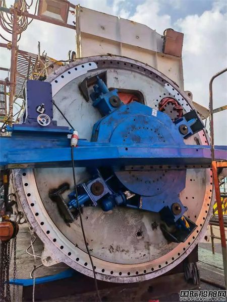 修理過程過程中,克令吊的回轉軸承經過激光檢測后,發現存在嚴重磨損情況,修復難度遠超預期。面對這種突發狀況,船廠第一時間做出了修理周期將延長的判斷,準備立即向船東辦公室匯報最新情況,并申請取消原計劃的下一個航次。在此關頭,公司的技術人員、總管小組快速提交了能守住原計劃節點的加工修復方案。經過磋商、探討,新的加工修復方案得到了船東認可,并獲得了軸承廠家的確認。該方案在施工過程中得到了嚴格執行,避免了修理周期延長,保住了原計劃航次,令船東大為感動和贊賞。