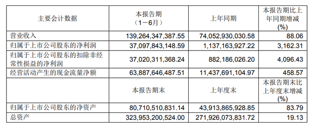 半年報顯示,第一季度營業收入648.43億元,實現凈利潤154.52億元。第二季度營業收入744.21億元,環比增長14.77%,第二季度實現凈利潤216.46億元,環比增長40.09%。