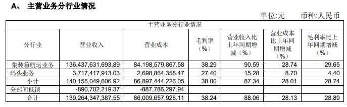 按主營業務板塊,上半年集裝箱航運業務板塊收入達到1364.38億元,同比增長90.59%,碼頭業務板塊收入達到37.17億元,同比增長15.28%。