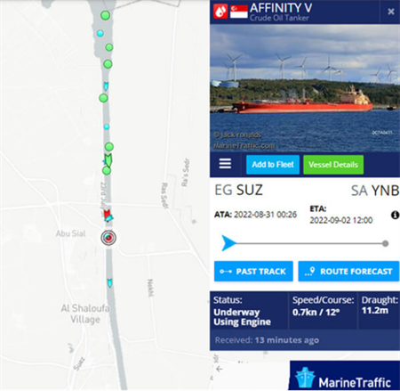 據悉,此次發生擱淺事故的油輪是在新加坡注冊的 114,600 載重噸的“Affinity V”號。這艘 6 年船齡的油輪此前已在葡萄牙卸下貨物,當時正在航行通過蘇伊士運河,計劃返回沙特阿拉伯裝載下一批貨物。該船長 828 英尺,據報道目前以 36.7 英尺的吃水深度航行。