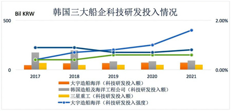 從2019~2021年數據來看,韓國三大造船企業總體營業收入從約31萬億韓元(約合255億美元)減少到約27萬億韓元(約合222億美元),下降13%;而同期研發投入從2025億韓元(約合1.66億美元)增加到2164億韓元(約合1.78億美元),增長了7%。其中,韓國造船海洋研發投入規模最大,而大宇造船研發投入強度最高。