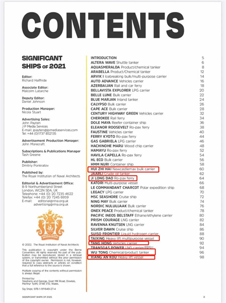 英國皇家造船工程師協會近日發布了其年度杰出船型名錄《SIGNIFICANT SHIPS OF 2021》,收錄了全球各船廠去年交付的43型杰出船型,其中入級中國船級社(CCS)有6型,她們分別是: