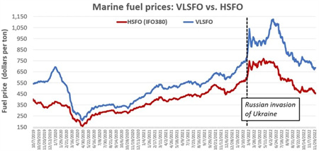 俄烏沖突升級后,船舶燃料價格飆升至前所未有的高點。雖然當前燃料價格仍處于較高水平,但已經回落到沖突升級前的水平,且由于市場預期需求疲軟,船用燃料仍處在下降通道。
