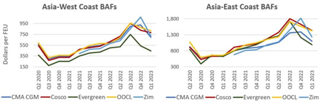 據估算,2023年第一季度,以星公司亞洲-美西航線的BAF將比2022年第四季度下降32%,至720美元/FEU;長榮亞洲-美西航線的BAF在2022年第三季度達到頂峰,第四季度將從最高水平下降41%至443美元/ FEU。而在亞洲-美東航線,達飛的BAF將環比下降21%至1098美元/ FEU。