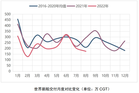 2022年1-8月,世界新造船市場(chǎng)成交5545萬載重噸(DWT)、2859萬修正總噸(CGT),同比分別下降41.5%、19.7%;完工交付5267萬DWT、1789萬CGT,同比分別下降10.9%、17.2%;截至8月底,手持訂單達(dá)到2.14億DWT、1.01億CGT,同比分別增長(zhǎng)8.6%、17.4%。以CGT計(jì),市場(chǎng)成交與完工交付的降幅較二季度分別擴(kuò)大5.2和2.7個(gè)百分點(diǎn)。不過,還是應(yīng)該看到,新船成交雖然出現(xiàn)下滑,依然較2016-2020年同期均值高出74%。完工交付的下滑也與疫情、罷工、高溫等外部因素有較大關(guān)系。