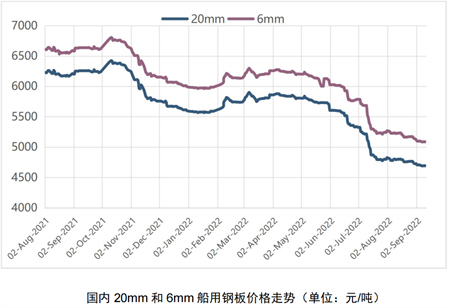 今年以來,國際大宗商品呈現(xiàn)出高位回調(diào)態(tài)勢(shì),其中以鐵礦石為代表的主力大宗商品表現(xiàn)最為明顯。8月末,中國鐵礦石價(jià)格指數(shù)(CIOPI)為368.8點(diǎn),同比下降188.51點(diǎn),降幅為33.82%;相比去年7月777.9的最高點(diǎn)已經(jīng)下降52.6%。價(jià)格方面,8月末,CIOPI國產(chǎn)鐵精礦價(jià)格為796.51元/噸,同比下降353.05元/噸,降幅為30.7%;CIOPI進(jìn)口粉礦到岸價(jià)格為99.95美元/噸,同比下降52.55美元/噸,降幅為34.5%。再看船用鋼板均價(jià)走勢(shì),6mm和20mm船用鋼板價(jià)格已經(jīng)分別從去年10月份最高點(diǎn)的6803元/噸和6423元/噸下降至今年9月初的5087元/噸和4692元/噸,降幅達(dá)到25.2%和26.9%。鐵礦石等大宗商品兼具商品和金融屬性,價(jià)格表現(xiàn)既受到市場(chǎng)供需關(guān)系影響,又牽涉貨幣政策等金融環(huán)境變化。市場(chǎng)主流觀點(diǎn)認(rèn)為,隨著海外市場(chǎng)通脹高企、國際流動(dòng)性逐漸緊縮,國內(nèi)外鋼材需求不振,短期的金融環(huán)境與供需關(guān)系很難改變,鋼價(jià)預(yù)計(jì)將繼續(xù)承壓。