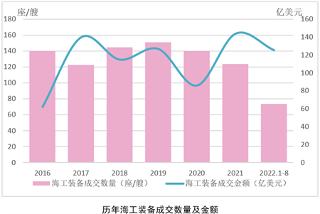 大額訂單來襲,海工裝備成交額同比大幅增長。憑借8月份兩艘高價值量FPSO訂單,全球海工市場成交總金額出現大幅提升。克拉克森數據顯示,2022年1-8月,全球成交海洋工程裝備訂單成交金額累計約126億美元,以金額計同比增長30%,已經接近去年全年的總成交額(145億美元)。8月份,全球共成交海工裝備3艘,其中,中集來福士獲得了巴西國油的P-80 FPSO船體合同;上海外高橋造船則從SBM Offshore獲得了1艘通用型FPSO船體合同;同方江新獲得1艘溢油應急船訂單。